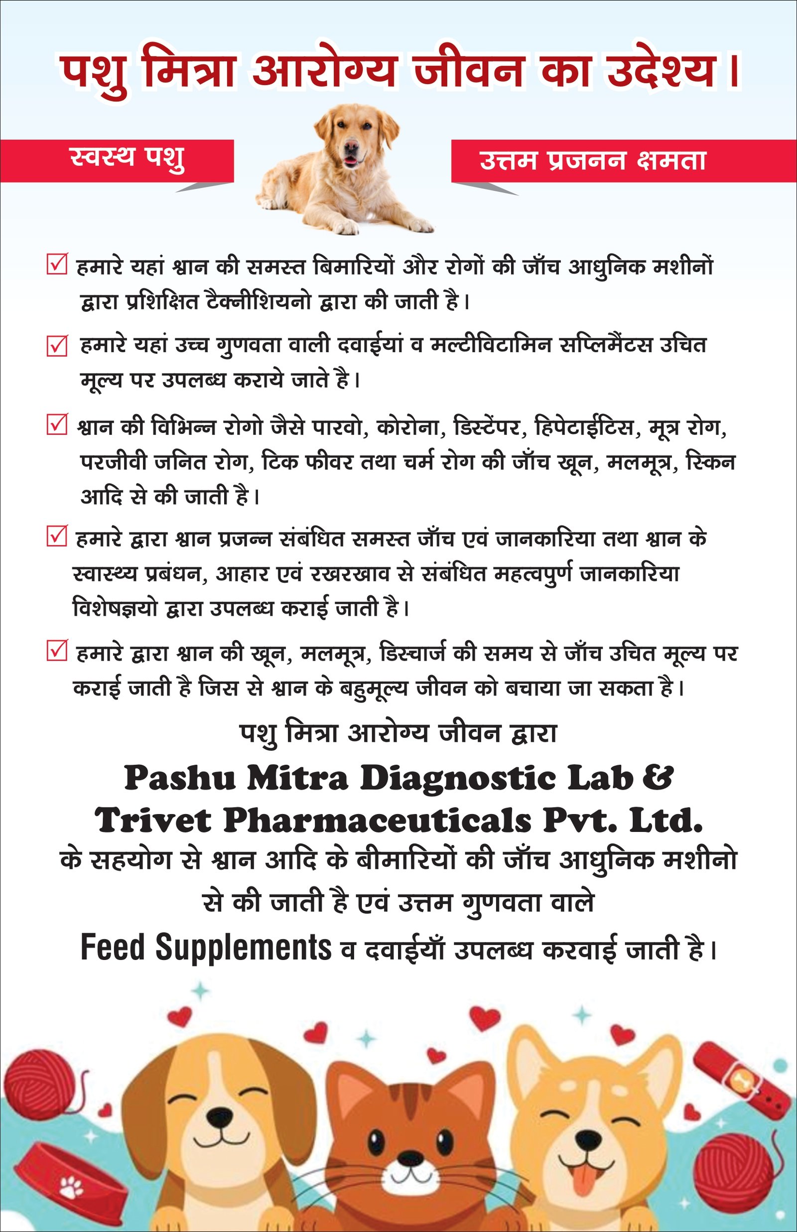 हम शामली में पशु स्वास्थ्य सेवाओं के लिए सबसे भरोसेमंद नाम हैं। वफादार कुत्तों और खेलती बिल्लियों से लेकर मेहनती गाय-भैंस और घोड़ों तक, हम आपके हर पशु की सेहत के लिए विशेषज्ञ देखभाल और सटीक समाधान देते हैं। आपके पशुओं की भलाई हमारी पहली जिम्मेदारी है, और हम हर कदम पर आपके साथ हैं!