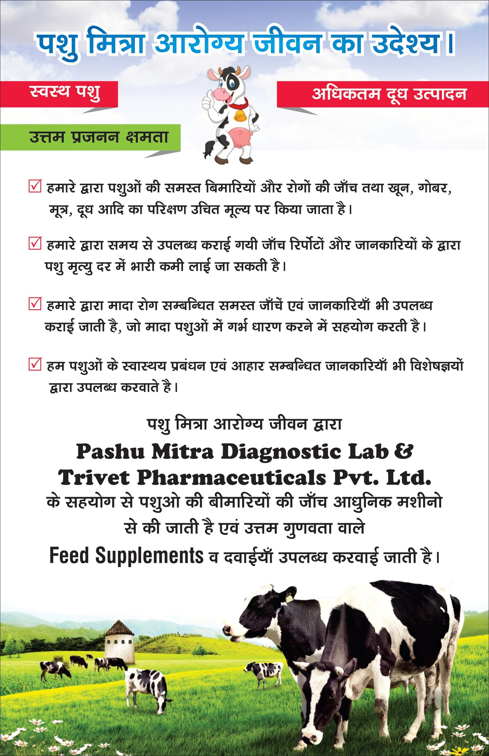 हर पशुपालक और किसान को सुलभ, सटीक और गुणवत्तापूर्ण पशु स्वास्थ्य सेवाएं प्रदान करना। हमारा उद्देश्य है पशुओं को स्वस्थ और खुशहाल बनाना।